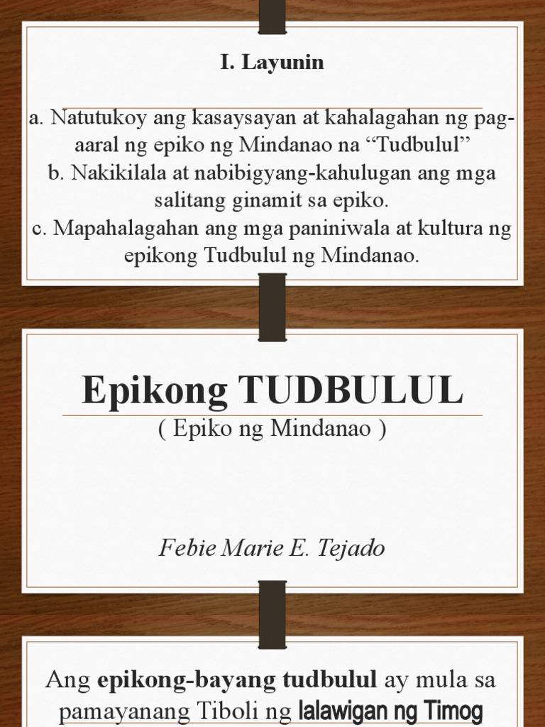 Ang Ilianon Epiko ng Mindanao mula sa Manobos ng North Cotabato Hudhud hi Aliguyon Awit ng Pag-aani ng Ifugao Kudaman mula sa Palawan Lumalindaw mula sa Gadang Ang Epiko ni Labaw Donggon ng. Narito ang buod ng naturang epiko. Tejado Ang epikong-bayang tudbulul ay mula sa pamayanang Tiboli ng lalawigan ng Timog Cotabato Mindanao.