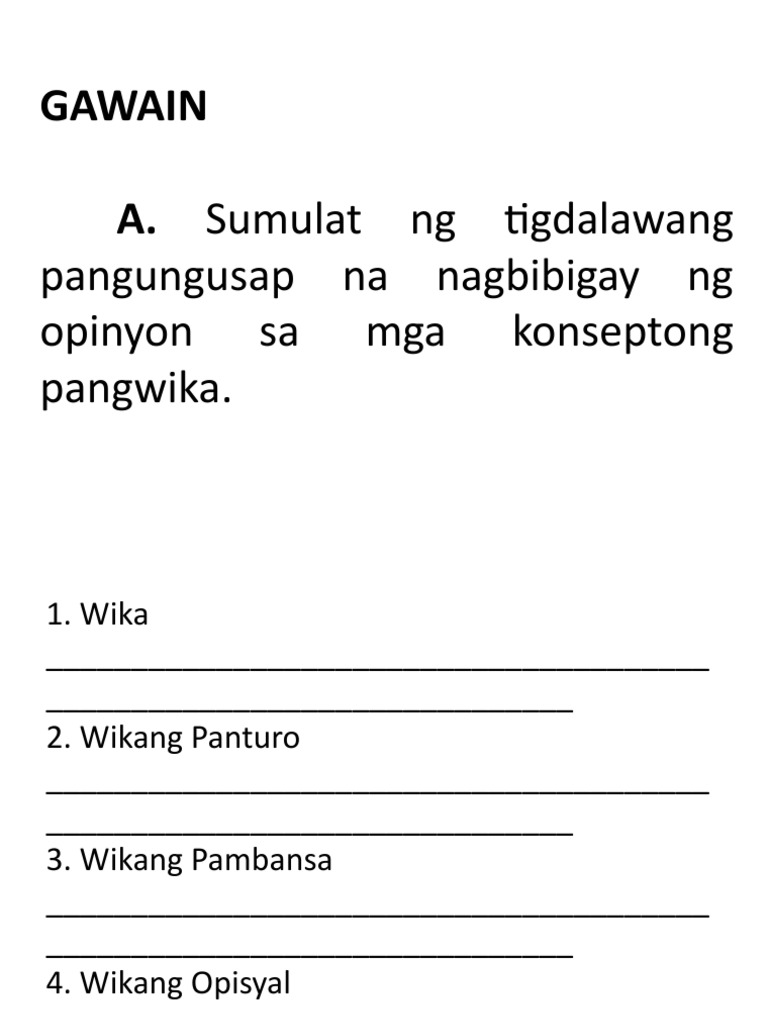 Ilahad nang komprehensibo ang kahulugan ng mga konseptong pangwika na. WIKA SA KULTURA Ang wika ang kaluluwa at saligan na bumubuo at humuhubog at nagbibigay diwa sa kultura KULTURA SA WIKA Ang kulturang Pilipino ay dapat. Pahayag at tukuyin kung alin sa mga gamit ng wika ang kaniyang isinakatuparan.