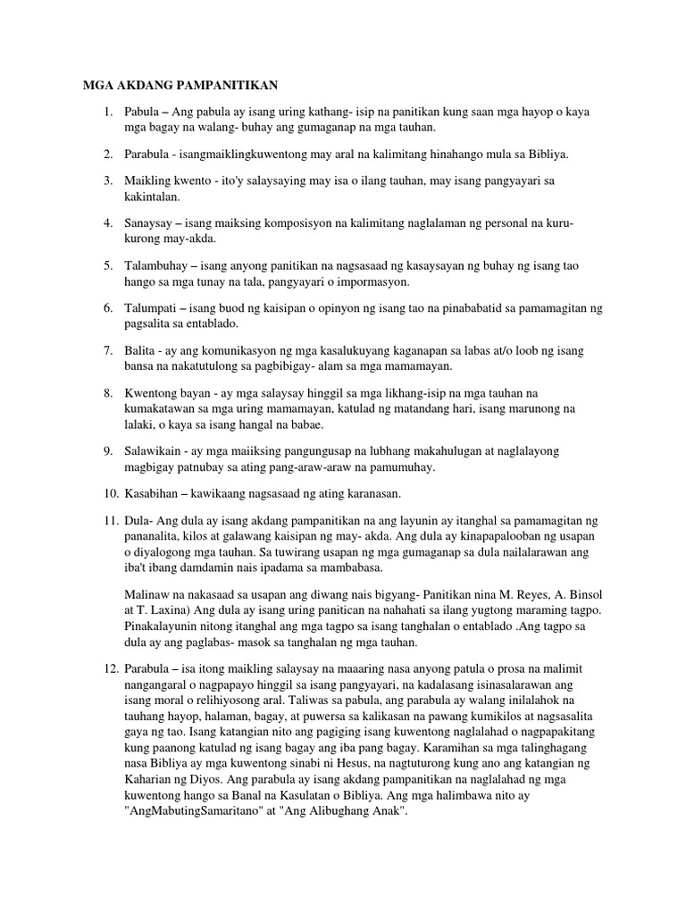 Ipaliwanag kung bakit ito ang sa palagay mo ang uri ng teoryang pampanitikan. Ang akdang pampanitikan ay tumutukoy sa mga akda o mga sulatin katulad ng mga tula maikling kwento pabula parabula epiko alamat sanaysay talumpati at marami pang ibaIto rin ay nagsasalaysay ng kaalaman damdamin kultura. Isang uri ng kuwentong bayan na nagtatampok ng hayop o iba pang hindi taong likha upang ipakilala ang kalakasan at kahinaan ng tao sa isang tiyak na karanasan.